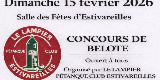 L'association "lampier club pétanque" d'Estivareilles organise un concours de belote le 15 février 2026 à la salle polyvalente communale. Les inscriptions se feront dès 13h30.